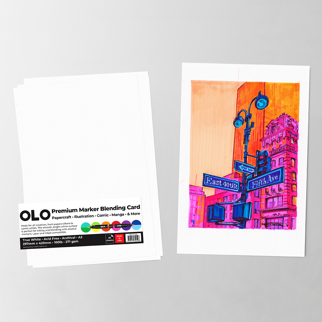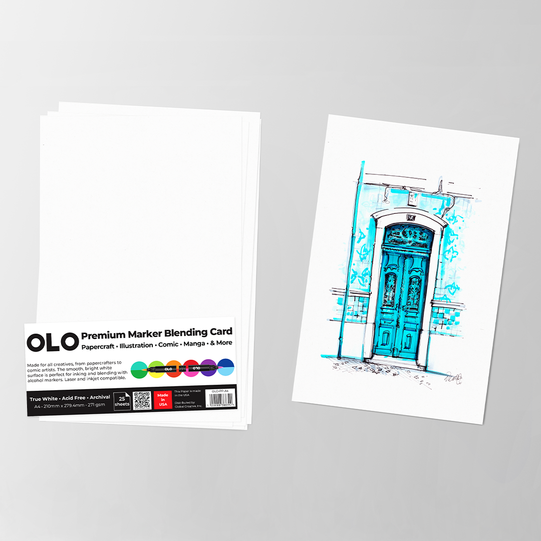 25 sheets per pack. True White. Acid-Free and archival. Available in four sizes: A4 (210 mm × 297 mm), A3 (297 mm × 420 mm), 8.5 × 11 in (215.9 mm × 279.4 mm), and 11 × 17 in (279.4 mm × 431.8 mm). 100 lb. Laser and inkjet compatible. OLO paper is made in the USA.