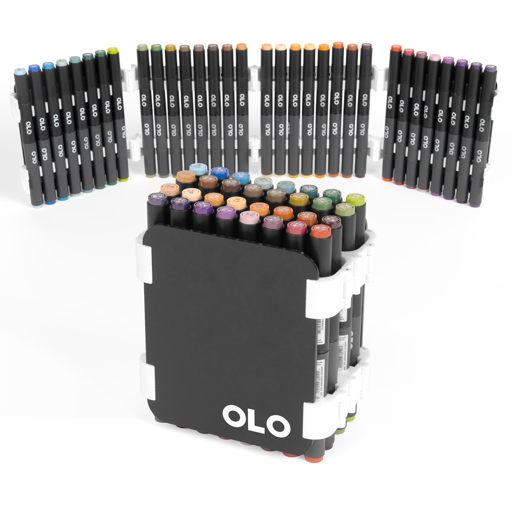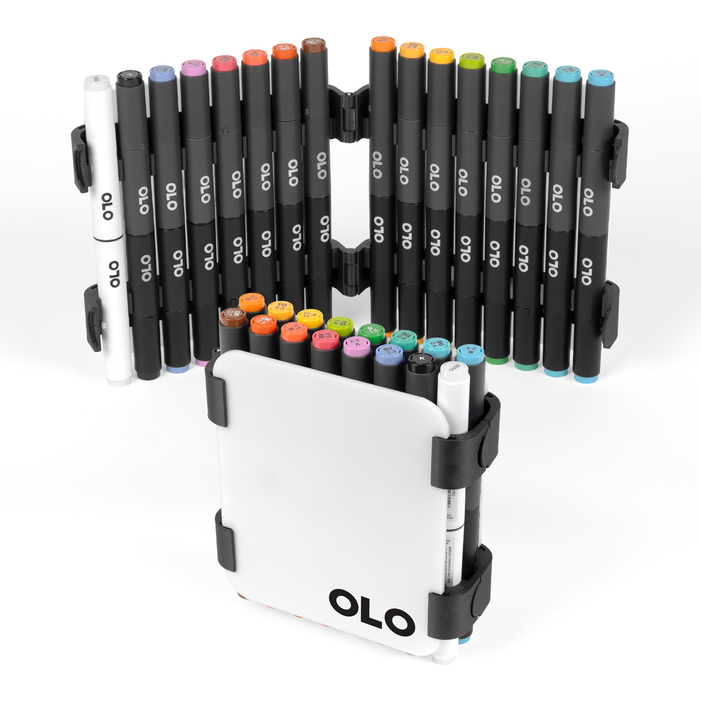 Curated themed sets of OLO brush/chisel markers, each paired with an OLO carry case as shown. The case can stand upright or lay flat for convenient access while you work, offering flexibility at home or on the go.