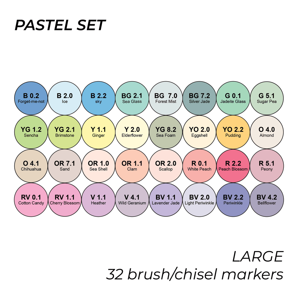 Choose between Small or Large themed sets. Small sets include 16 curated brush/chisel markers, and Large sets include 32 brush/chisel markers for expanded variation and smoother transitions between hues.