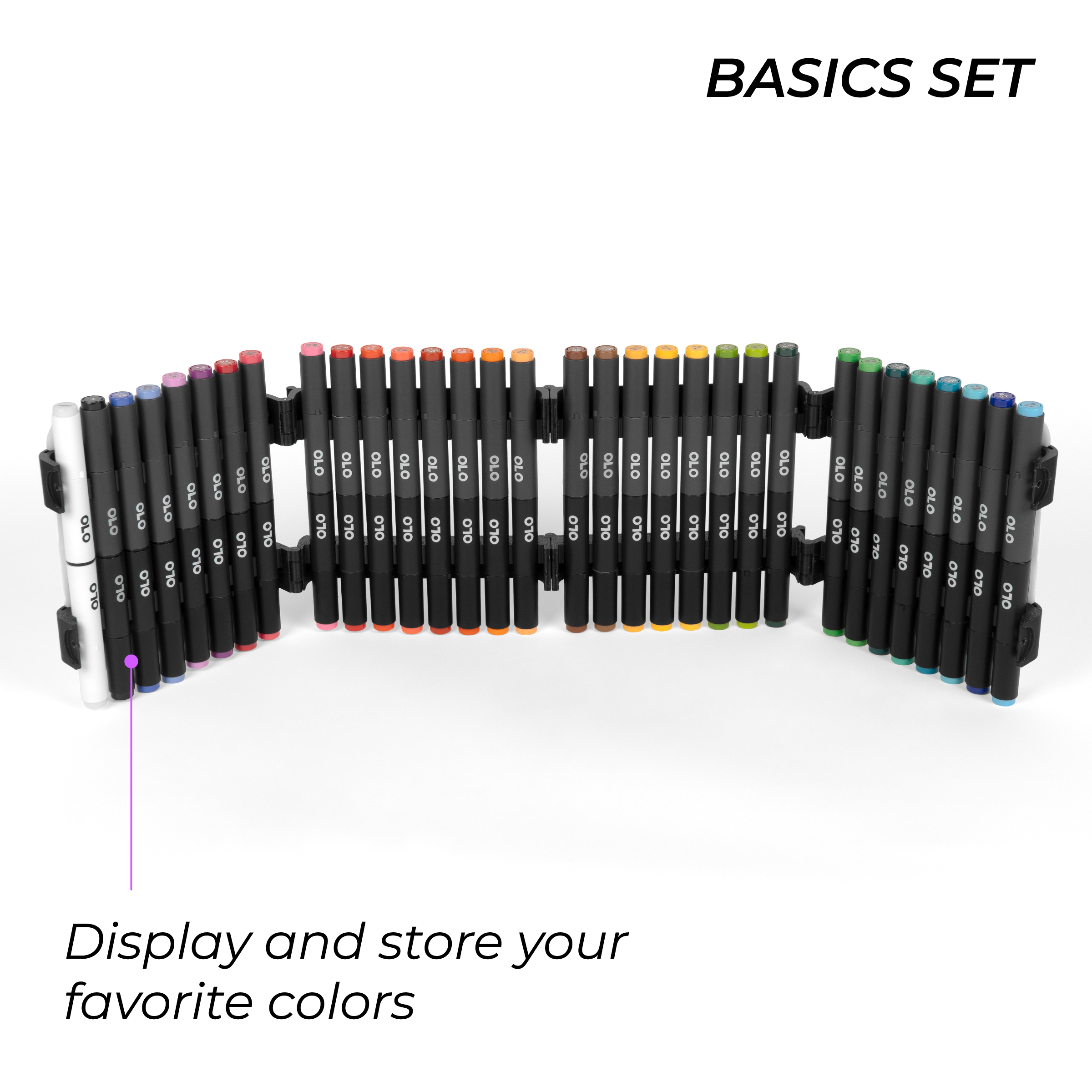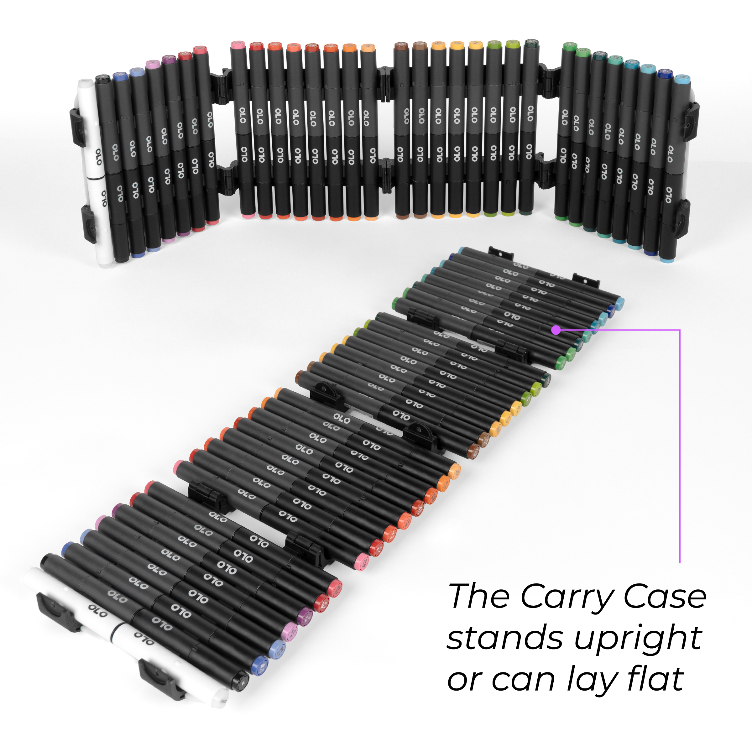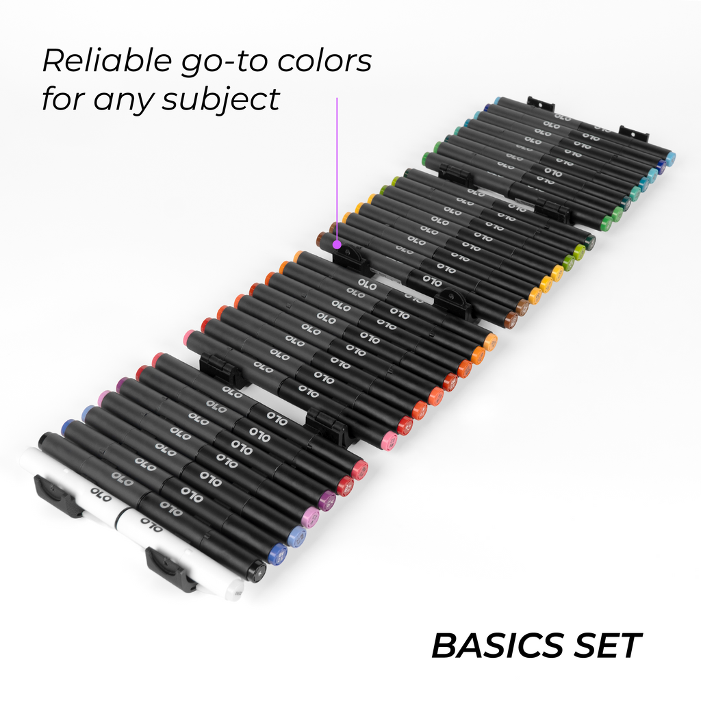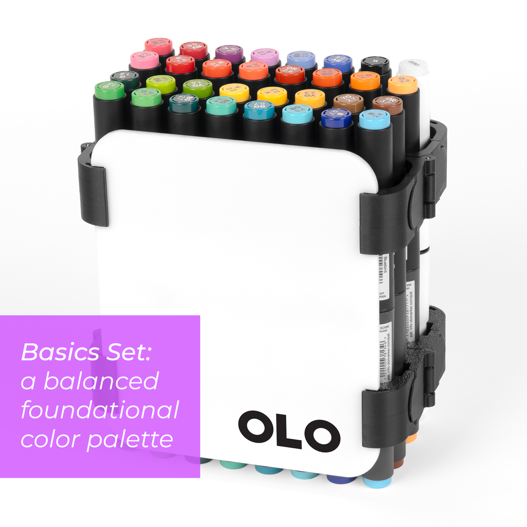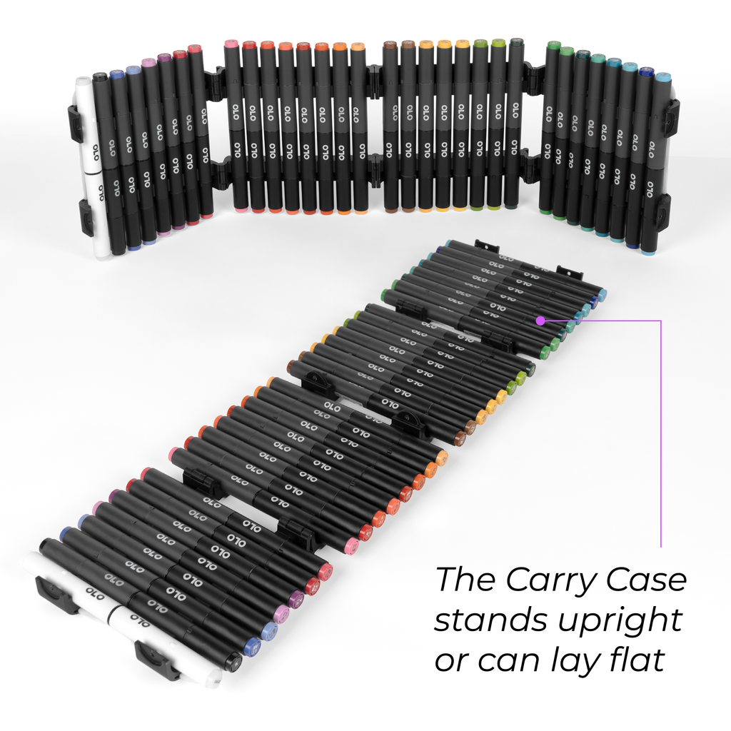 Introducing new themed sets of OLO brush/chisel markers, curated to fit the way you create. Each set is paired with an OLO carry case as shown. Choose between Small or Large sets. Small sets include 16 curated brush/chisel markers for focused palettes, while Large sets include 32 brush/chisel markers for expanded variation and smoother transitions between hues.