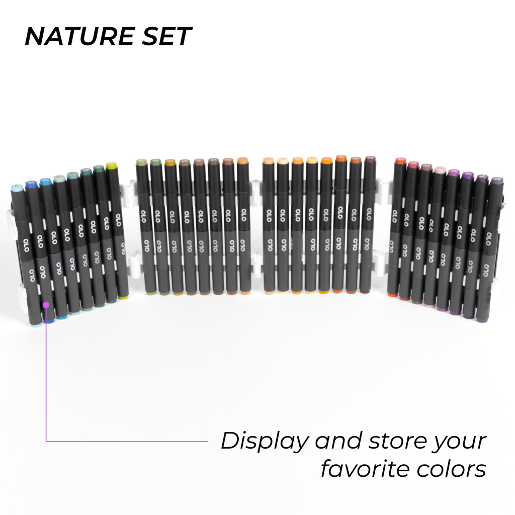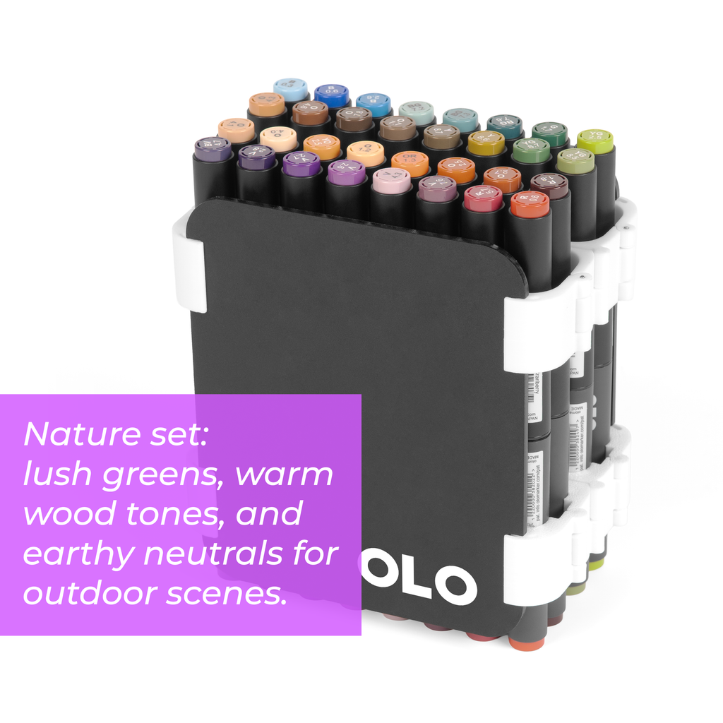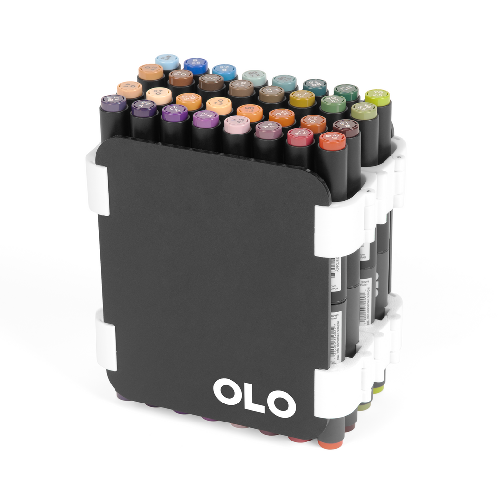Introducing new themed sets of OLO brush/chisel markers, curated to fit the way you create. Each set is paired with an OLO carry case as shown. Choose between Small or Large sets. Small sets include 16 curated brush/chisel markers for focused palettes, while Large sets include 32 brush/chisel markers for expanded variation and smoother transitions between hues.