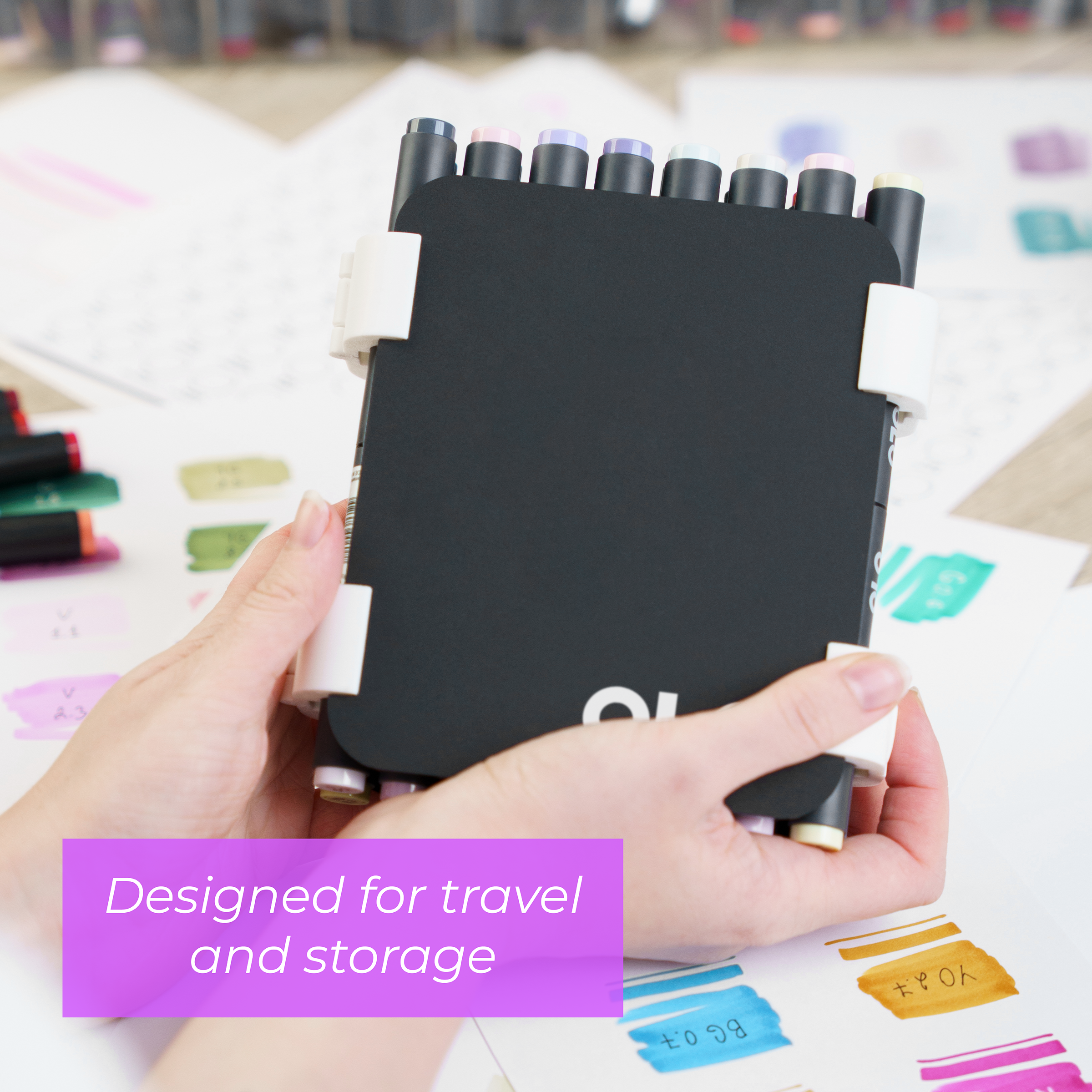 The carry case features black panels, white clips, and black connector rings, and can be positioned standing upright or laid flat for easy access to colors and nibs. Its space-efficient design supports a clean, focused workspace whether you are working in a studio or traveling for studies.