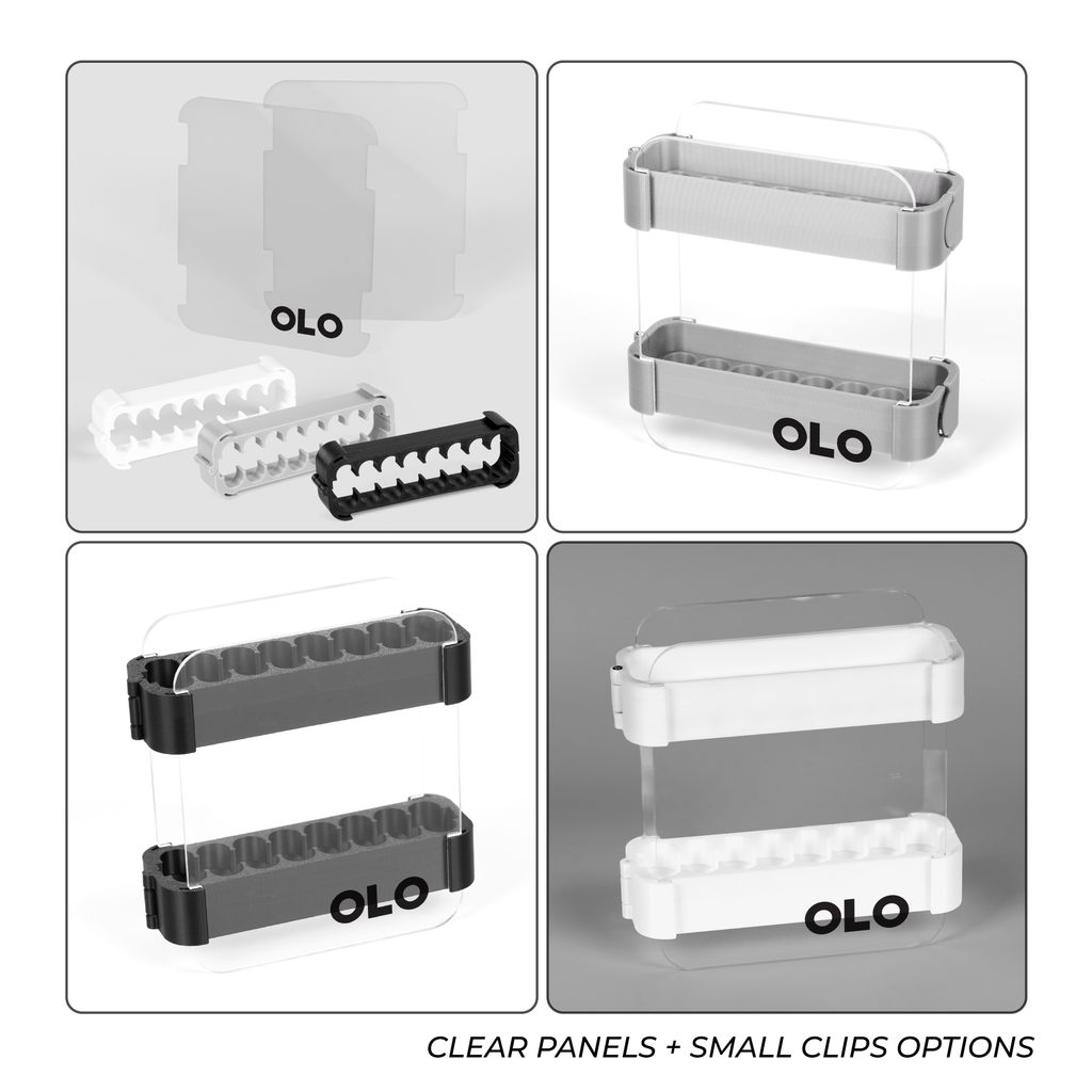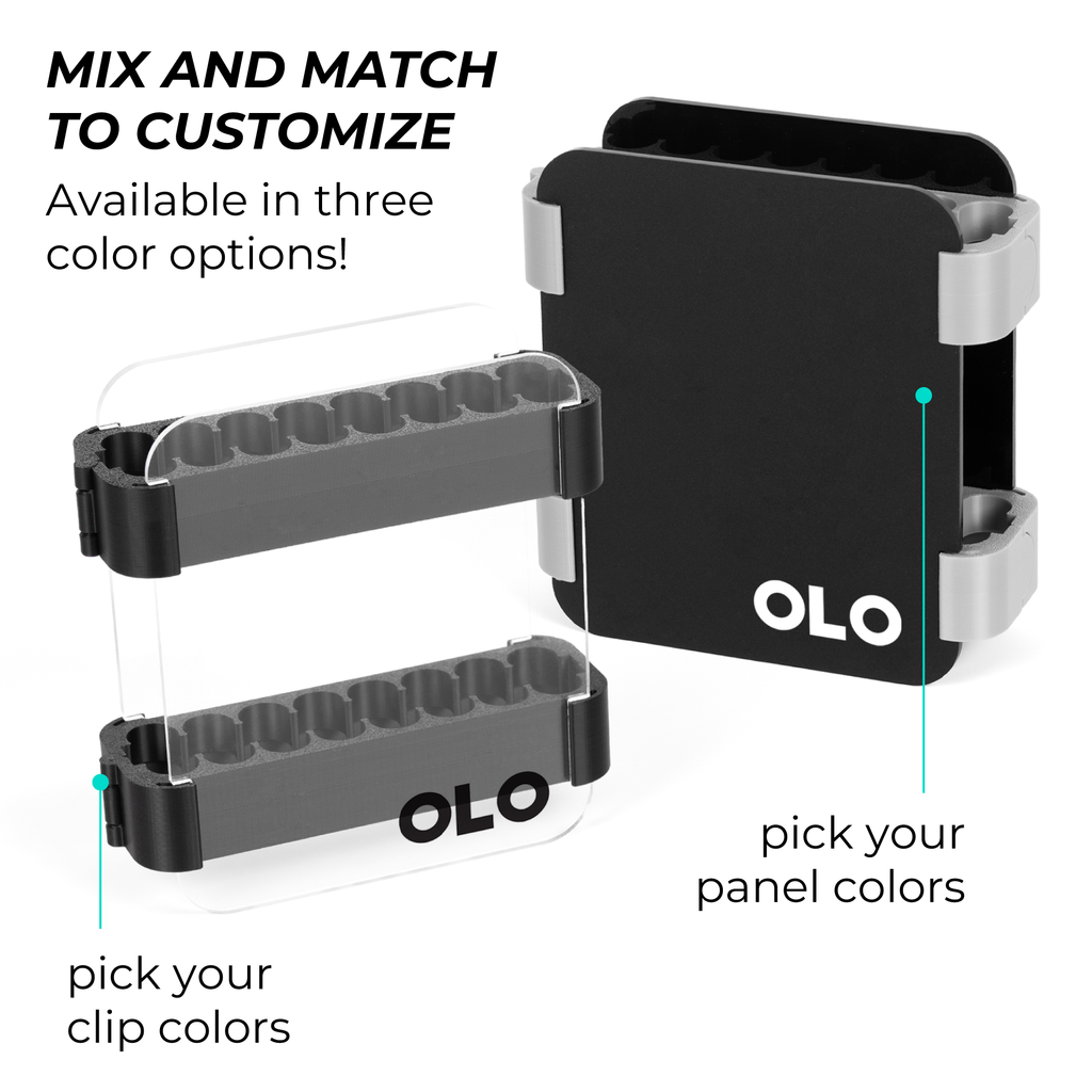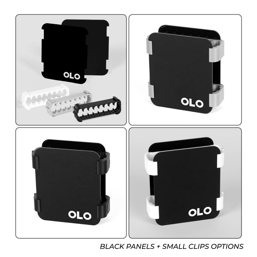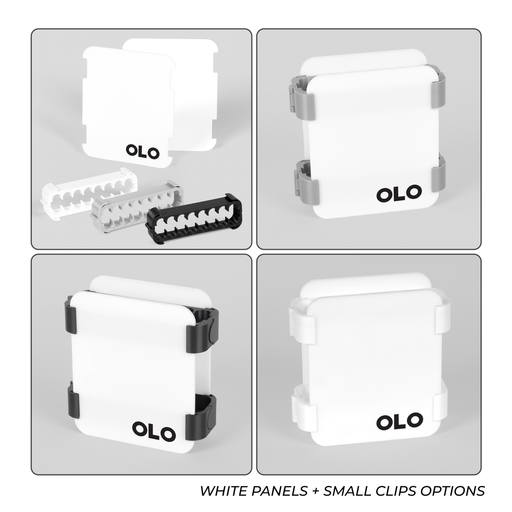 Pick Your Panels. Choose your panel pair colors: Clear, White, or Black. Branded with the OLO logo.