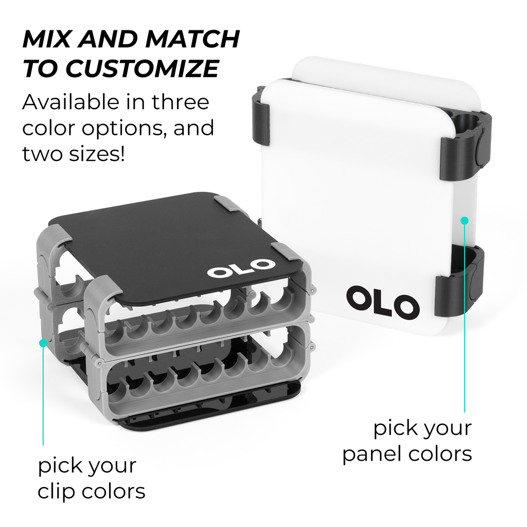 Pick Your Panels. Choose your panel pair colors: Clear, White, or Black. Branded with the OLO logo.