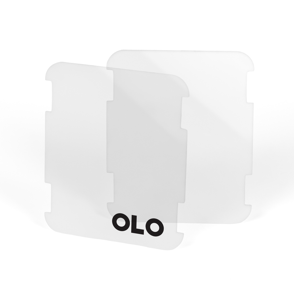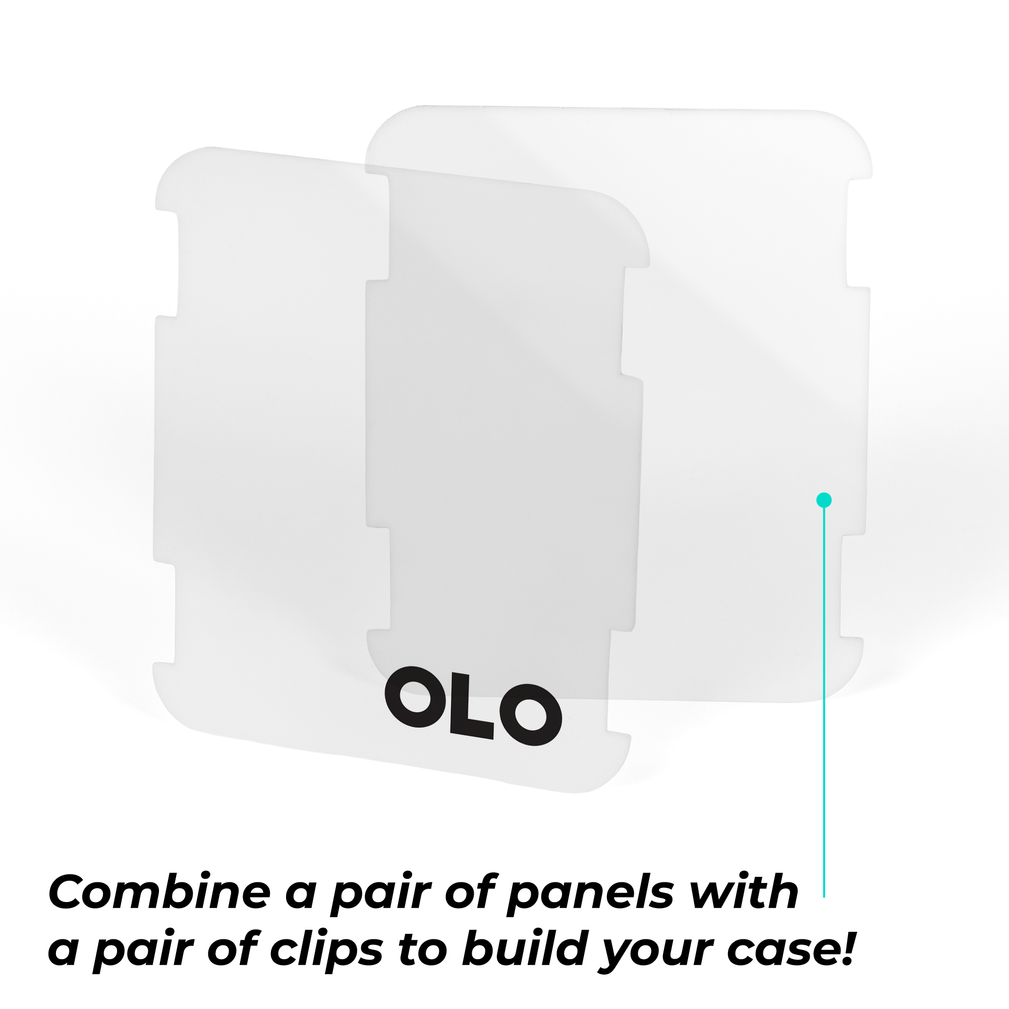 OLO Carry Case Panels (2x). Each OLO Carry Case is made from one set of panels and one set of clips. Panels are available in white, black, and clear. Branded with the OLO logo on 1 panel side.