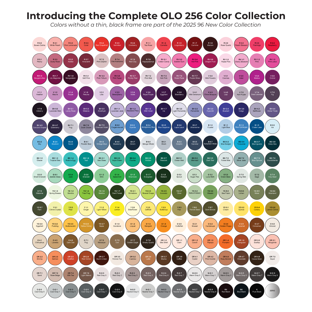 Discover the vibrant possibilities of the new OLO™ marker 96-color expansion with this curated 32-color set. Each set features unique hues with no repeats and is designed to expand your creative palette and enhance blending across a wide range of projects.