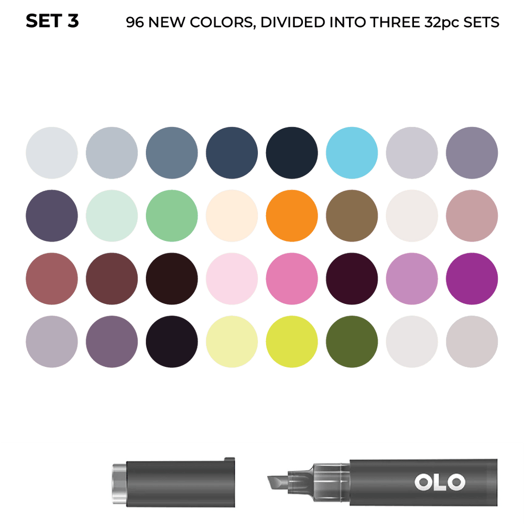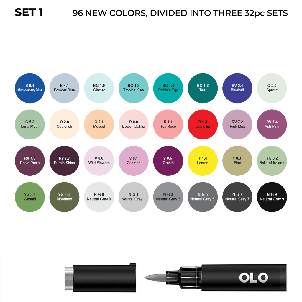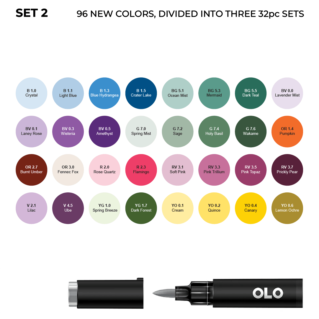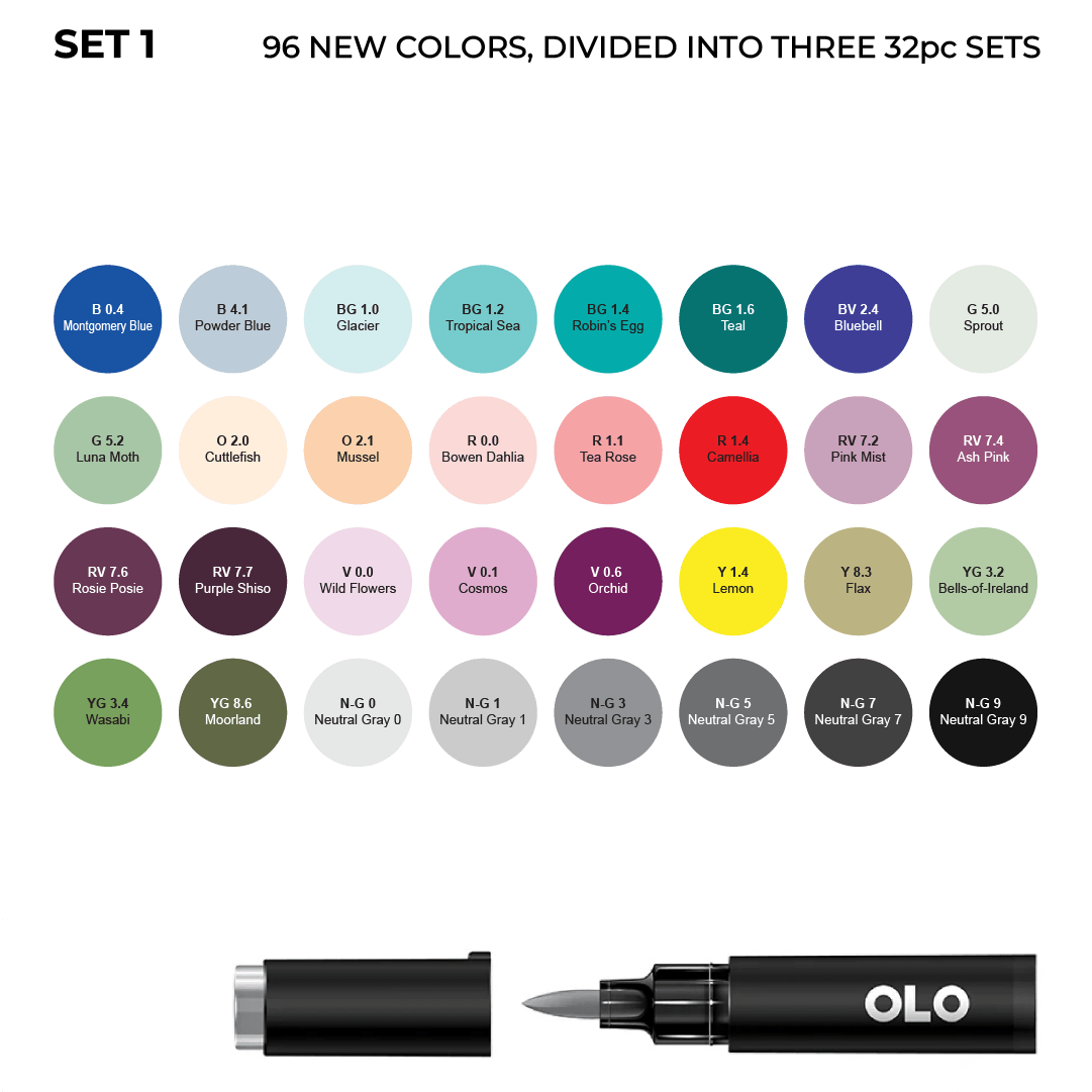 The 96 new OLO colors are now available as three 32pc sets. Sets 1, 2, and 3 together make up the full 96-color expansion. No repeats.