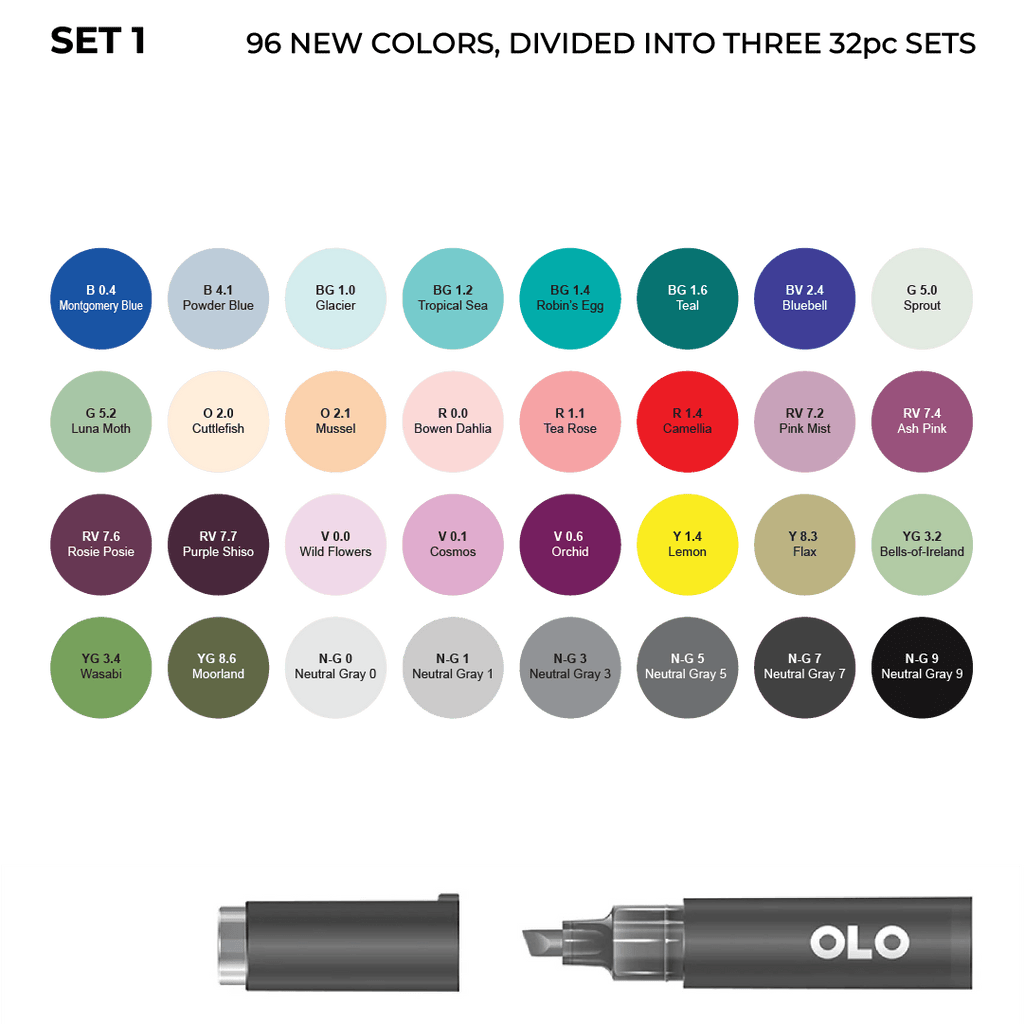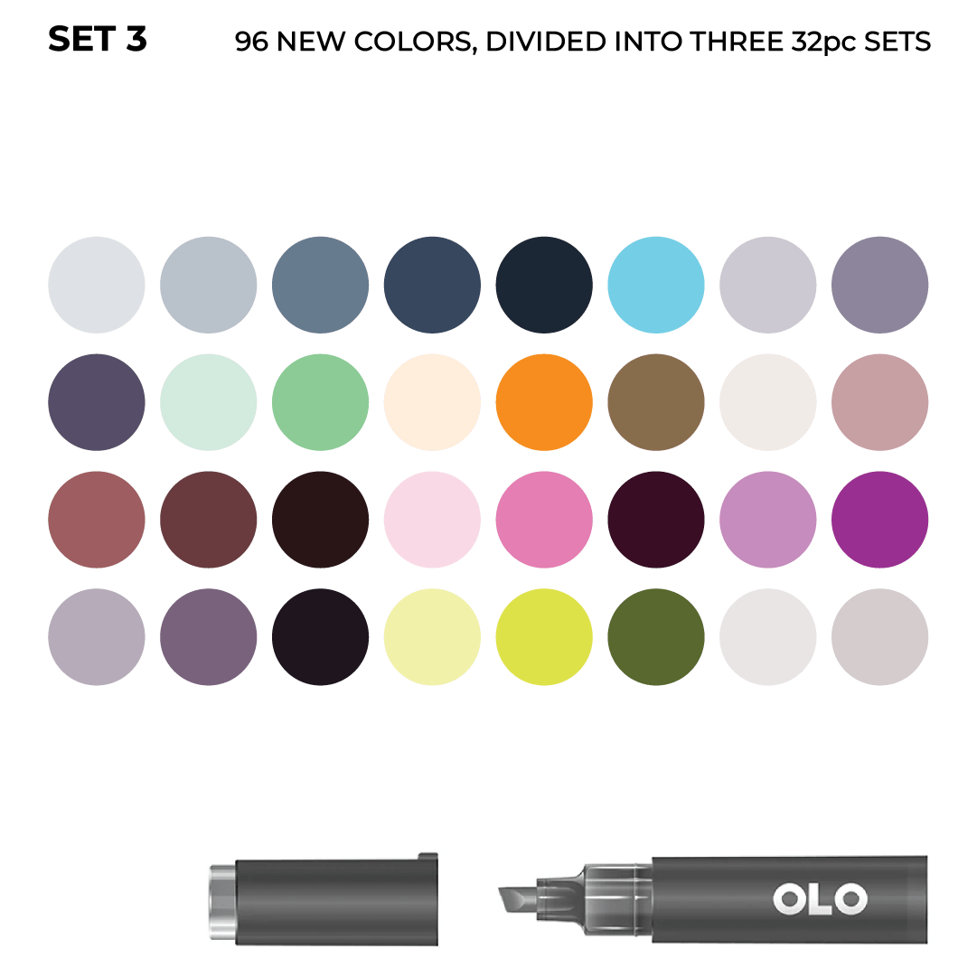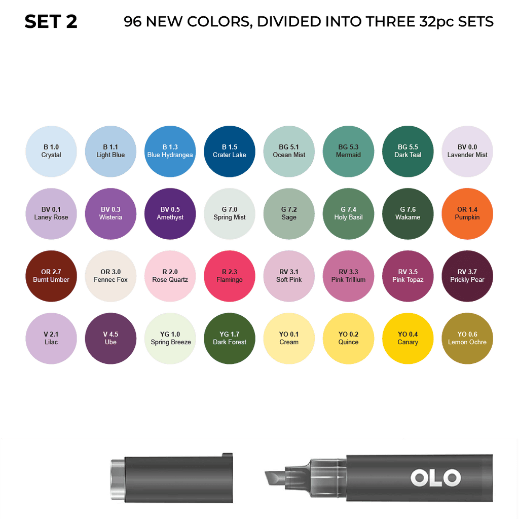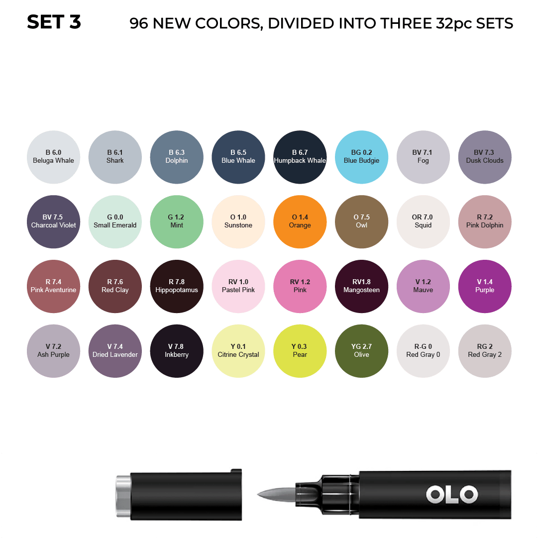 The 96 new OLO colors are now available as three 32pc sets. Sets 1, 2, and 3 together make up the full 96-color expansion. No repeats.