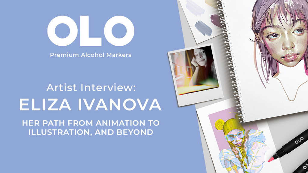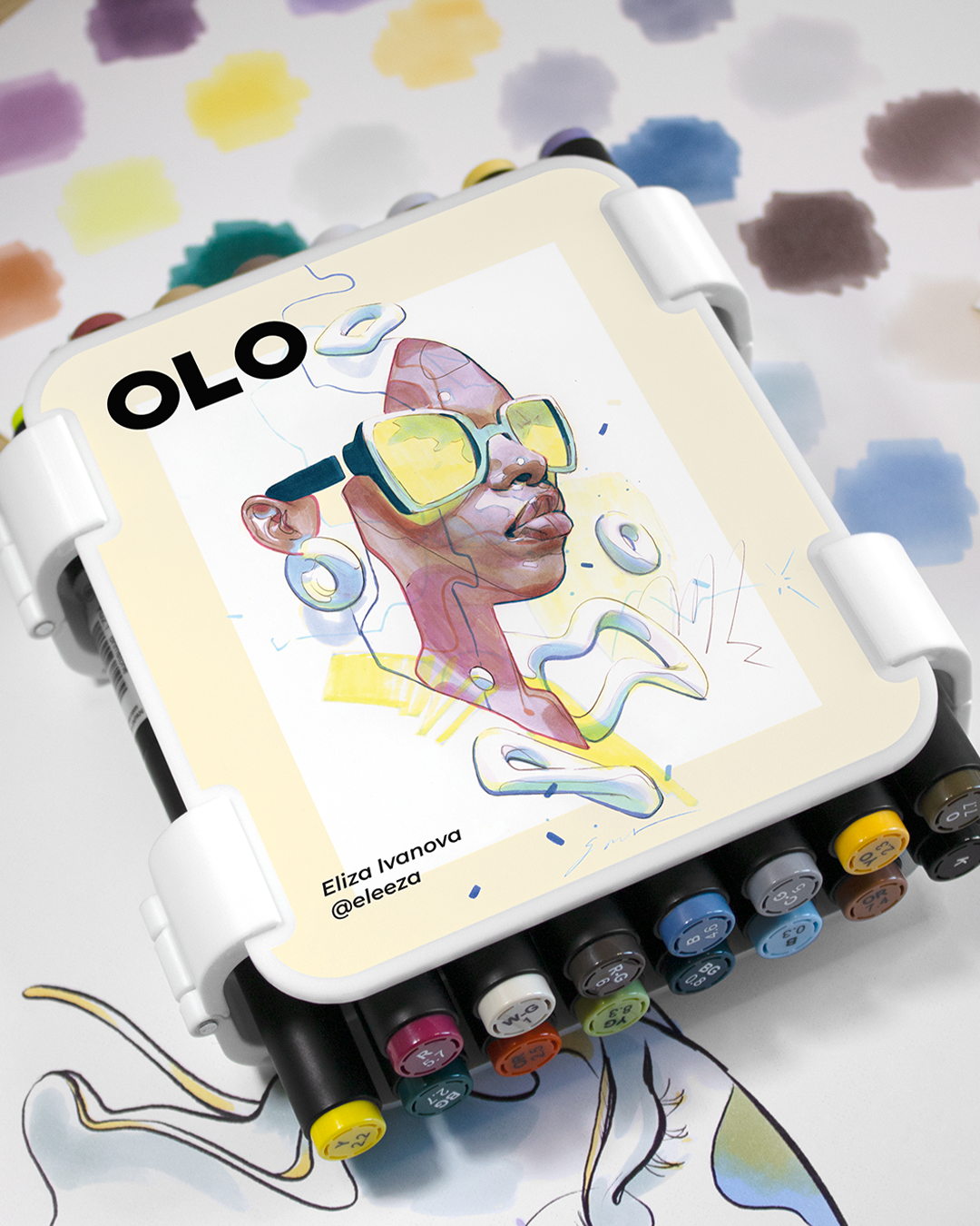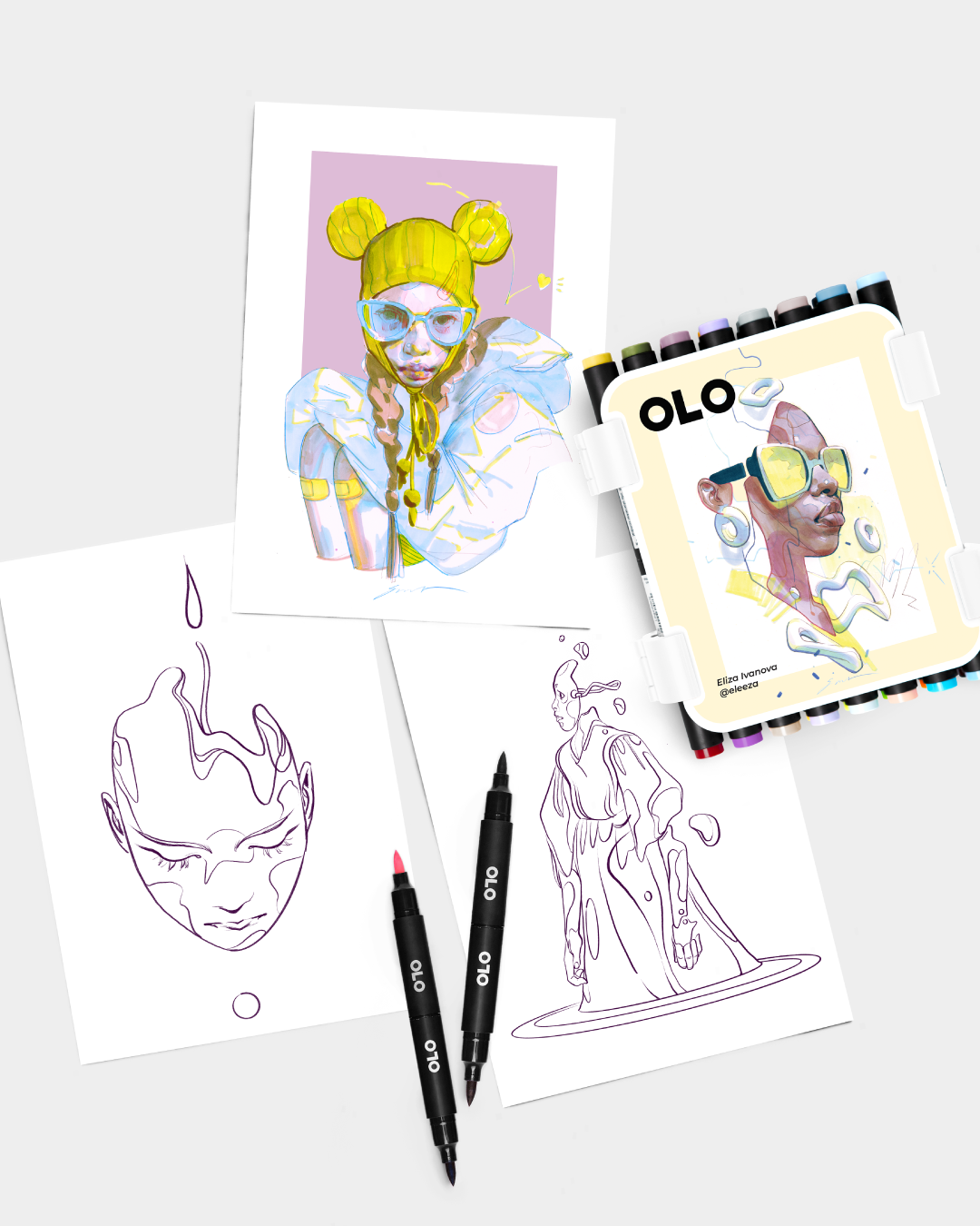 Award-winning artist Eliza Ivanova has curated 32 OLO™ markers colors and designed a custom OLO carry case featuring her original artwork. Each set also includes a 6" x 9" art print, two 6" x 9" line art prints by Eliza on OLO premium marker paper, an OLO paper pack, and a mini 160-color swatch chart.
